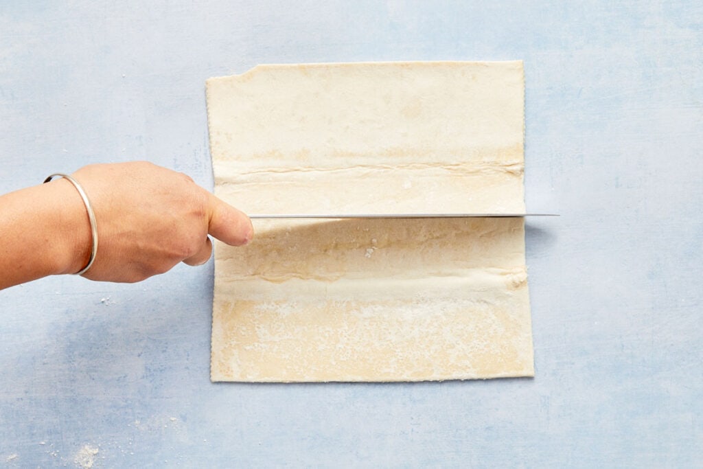 If using Puff Pastry: Cut each sheet lengthwise into 3 strips, then crosswise into 4 strips. You should have 12 pieces per sheet (24 total).