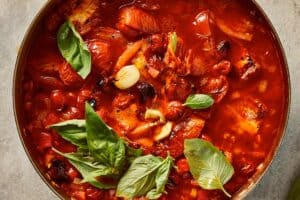 • Add the roasted tomatoes, garlic, and basil to the broth and continue simmering for about 2 minutes, until the basil softens.